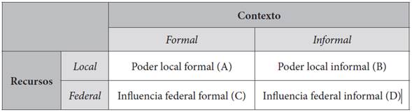 Ambos recursos están sustentados en contextos formales e informales; es decir, los primeros emanan de normas (leyes) ya establecidas; el candidato ganador tiene acceso a estos en el momento de tomar posesión de la gubernatura; los segundos son un entramado que lo conforman escenarios coyunturales y resultados electorales que le pueden brindar mayores capacidades, que no están escritas en ningún lado;(20) este cruce se refleja en el cuadro 1.