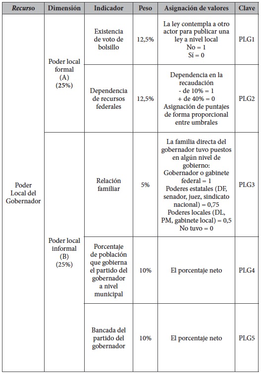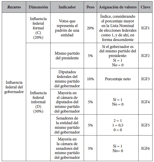 Por todo lo anterior, pensamos que la influencia que posee un gobernador en la política federal es un punto clave para identificar el poder que este tiene. Y como vimos, después del año 2000, las arenas en las que puede influir se han diversificado. Por ello, proponemos que este recurso debe representar un peso similar al que un gobernador tiene en el nivel local.