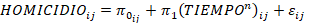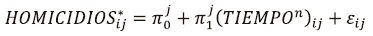 De acuerdo con nuestra formulación, en el modelo anterior (Modelo 1) las tasas de homicidio por cada 10.000 habitantes son expresadas como una función de un polinomio que representa la forma funcional del cambio asociado al paso del tiempo (Nivel 1) y un error, a nivel municipal, independiente e idénticamente distribuido. A este nivel, la tasa de 𝐻𝑜𝑚𝑖𝑐𝑖𝑑𝑖𝑜, para cada municipio i, en cada momento j, es descrito por un nivel promedio inicial para todos los municipios del país en el 2003, y un polinomio estimado por 𝜋 1 en donde la relación lineal, cuadrática y cúbica de una unidad de paso en el tiempo (años) se asocia con cambios en el nivel promedio de tasas de homicidios para el conjunto de municipios en el país.