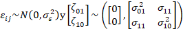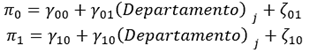 De la misma manera, en el Nivel 2, representamos diferentes valores iniciales en las tasas de homicidio asociadas con diferencias departamentales en el 2003, y diferencias departamentales en las pendientes de cambio en el tiempo que representan las tasas de cambio especificadas
