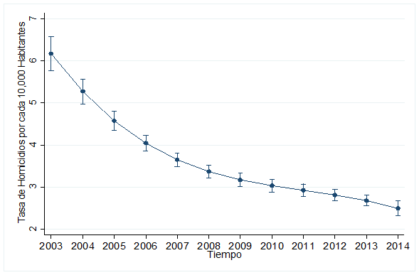 De acuerdo con estos resultados, a nivel nacional, estimamos que, en 2003 en promedio había 4.79 homicidios por cada 10.000 habitantes, luego de controlar por efectos fijos de departamento. Adicionalmente, encontramos una tasa de cambio cúbica, es la forma funcional que mejor se ajusta a la evolución del indicador en el tiempo y esta tiende a la baja para cada año entre 2003 y 2014. De esta manera, la presencia de un término cuadrático, siguiere que esta tasa es decreciente, es decir, que se reduce a lo largo del tiempo. Así, mientras en el periodo 2003-2004 se estima una disminución de 0.89 homicidios por 10.000 habitantes, para el periodo 2012-2013 la diferencia es de 0.20 casos y en 2013-2014 de 0.19 casos. La Gráfica 1 muestra cómo ha sido la evolución estimada en los últimos años.
