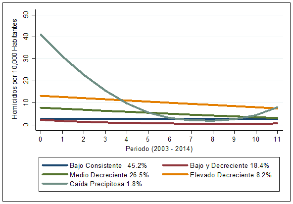 La evidencia empírica que encontramos sugiere la existencia de una relación negativa entre del desempeño de Estado local y las trayectorias de este tipo de violencia. En promedio, los cambios positivos en el funcionamiento de su representación municipal (mejor desempeño o cumplimiento de su rol), se asocian con disminuciones en los niveles de homicidio. Si bien observamos un decremento promedio de los niveles de homicidios a nivel nacional, nuestros resultados también revelan una importante variabilidad alrededor de este promedio. Al explorar distintos patrones en esta variabilidad, identificamos cinco grupos de municipios que si bien, de manera general presentan un decremento en sus tasas de homicidios a lo largo del tiempo, siguen patrones de cambio diferentes. Esta evidencia soporta nuestra hipótesis inicial sobre la existencia de importantes diferencias en el tiempo y en el espacio (González 2014; González et al. 2003).
