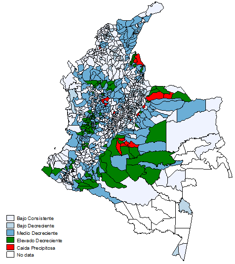 Como se ve en la Gráfica 2, el gran cambio para las zonas más violentas comienza a verse a partir del 2004, lo que coincide con el inicio del proceso de desmovilización de los paramilitares. Para 2007 estos municipios ya no eran los más violentos del país y al contrario los que conforman el grupo de “elevado decreciente” pasan a tener las tasas más altas de homicidio, e incluso muestran un crecimiento temporal entre 2009 y 2012. Lo anterior muestra que, si bien la tendencia nacional ha sido consistente con la reducción de las tasas de homicidio, en respuesta al desescalamiento del conflicto armado, ha habido un proceso paralelo de reconfiguración espacial del crimen en algunas regiones del país, asociado potencialmente, a las dinámicas del narcotráfico.