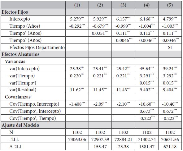 Buscando identificar la forma funcional del cambio promedio en el tiempo, estimamos 5 diferentes variantes del Modelo 1. En cada una de las columnas de la tabla 1, presentamos los resultados asociados con esta estimación. Por ejemplo, en la primera columna, presentamos los resultados observados al representar el cambio en el tiempo con una función lineal (Tiempo), en la segunda columna, extendemos dicho modelo para incluir una función cuadrática (Tiempo2), mientras que en la tercera columna incluimos una función cubica de tiempo (Tiempo3). Construyendo a partir de esta taxonomía de modelos, en la cuarta y quinta columna de la tabla 1, una especificación en donde un componente de varianza asociado con la función cuadrática del tiempo es estimado (columna 4), y finalmente una estimación en donde las potenciales diferencias entre departamentos, en la trayectoria promedio estimada son representadas con un vector de efectos fijos.