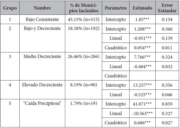 En este sentido, en los resultados presentados en la Tabla 1(3) nuestro énfasis se encontraba en describir la trayectoria promedio de cambio en el tiempo en las tasas de homicidios reportados, mientras que en los resultados presentados a continuación (ver Tabla 2) nos enfocamos en la variabilidad reportada en los mismos. Para describir dicha variabilidad, un modelo de mezcla finita (Nagin 2005), nos permite agrupar municipios que describen trayectorias similares de cambio a lo largo del tiempo. En la Tabla 2 las filas presentan distintos grupos identificados en los datos, la proporción de municipios que hacen parte de esta categoría identificada, y los parámetros estimados que describen la forma funcional de la trayectoria estimada para cada grupo (acompañamos los resultados estimados de este modelo, con la gráfica 2).