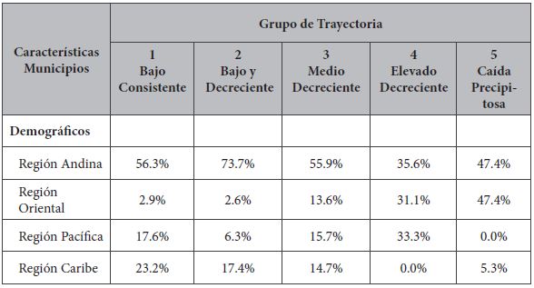 Como es posible observar en la tabla 2, si bien observamos unas trayectorias decrecientes en la mayoría de los grupos de municipios identificados (ver grupos 2 al 5 de la tabla 2); existen también diferencias importantes en los niveles iniciales y las tasas de cambio identificadas. Un primer resultado indica que para el periodo entre 2003-2014 el 45% de los municipios colombianos, que clasificamos en la categoría “Bajo consistente”, tenían una tasa de homicidio de 1.85 homicidios por cada 10.000 habitantes, que es similar al índice para países europeos como Holanda o Dinamarca (Banco Mundial, 2016). Estos municipios están ubicados principalmente en la región Andina (56.3%) y Caribe (23.2%) (ver tabla 3), consistente con Sánchez et al. (2012), quienes identifican que para el período de estudio los departamentos que fueron consistentemente más pacíficos son Boyacá y Atlántico.