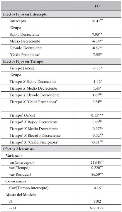 Para evaluar el ajuste de distintas formas funcionales de cambio en el tiempo a nuestros datos, estimaremos una serie de modelos anidados en donde términos lineales, cúbicos, y cuadráticos son progresivamente incluidos en el modelo. Evaluamos el cambio en el ajuste del modelo a los datos comparando el cambio en el estadístico de ajuste de máxima verosimilitud frente a una distribución con grados de libertad dados por el número de parámetros adicionales en cada modelo. Los resultados de esta estimación son presentados en la Tabla 1, de la sección de resultados.