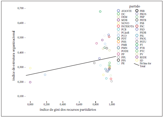 Como aponta a tabela 4, a maioria dos partidos brasileiros concentrou recursos em poucos nomes, com coeficientes de Gini que chegaram acima de 0,99, quando apenas um único candidato (no caso do Patri e PPL, o presidente da agremiação) utilizou praticamente todo o recurso partidário para sua campanha eleitoral. O gráfico 1 apresenta a correlação entre o coeficiente de Gini dos partidos e o índice de estrutura organizacional (IEP).