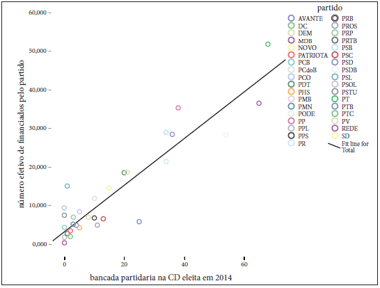 Como mostra a reta da correlação, as duas variáveis apresentam vetor positivo, mas fraco. Mesmo para padrões de comportamento de instituições políticas, normalmente mais fluidas do que outras (Peters 2012), não é possível dizer que há qualquer relação entre a estrutura organizacional dos partidos e a forma com que eles distribuem recursos financeiros à nominata eleitoral. Diferentemente dos partidos nos Estados Unidos, em que as organizações com maior aporte costumam distribuir mais recursos àqueles que não são apoiados pelos financiadores privados (Gierzynski e Breaux 1994), e dos partidos do Japão, em que há uma distribuição equânime entre os candidatos às eleições proporcionais (Carlson 2012), os partidos brasileiros, independentemente de sua força organizacional, financiam apenas poucos candidatos, promovendo o que Schaefer (2018) sugere como “listas fechadas”, impulsionadas aqui pela direção nacional do partido, que investe em um grupo seleto de indivíduos.