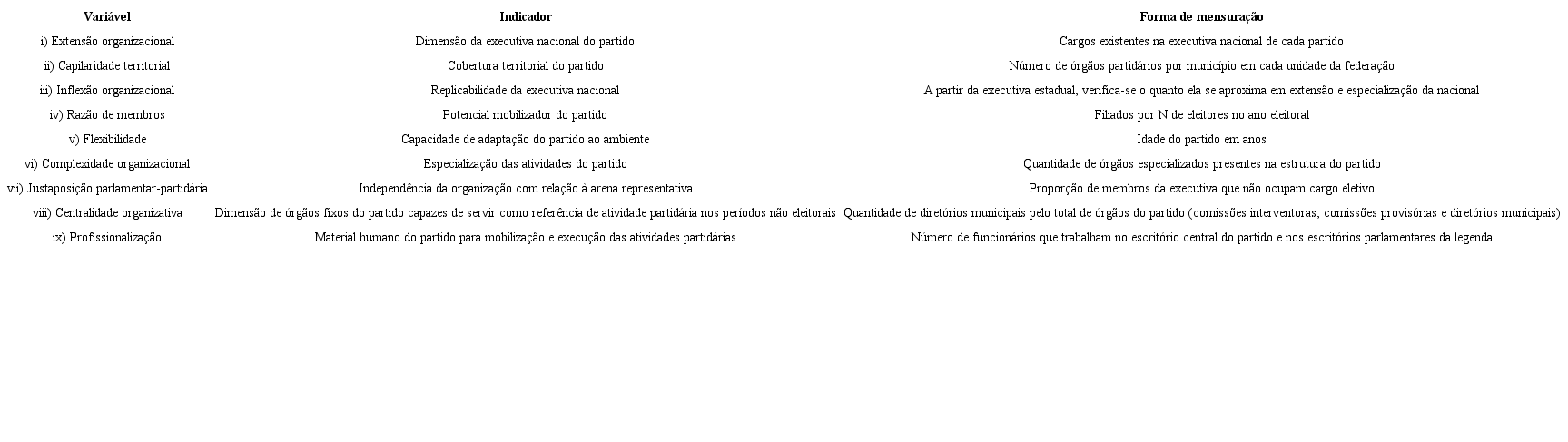 O tabela 1 resume as variáveis e os indicadores empíricos utilizados para mensurar a estrutura organizacional dos 32 partidos que disputaram o pleito parlamentar nacional de 2014.