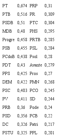 Para a aplicação do indicador de estrutura organizacional, normalizamos os valores das variáveis em escala variando de zero a um.8 A partir disso, fizemos uma média aritmética dos valores em que cada somatório de cada partido foi dividido pelo total de variáveis coletadas (nove). Os dados coletados apontam que o indicador apresenta consistência interna aceitável, com alfa de Cronbach = 0,640,9 de modo que não precisamos proceder à purificação da variância do índice.