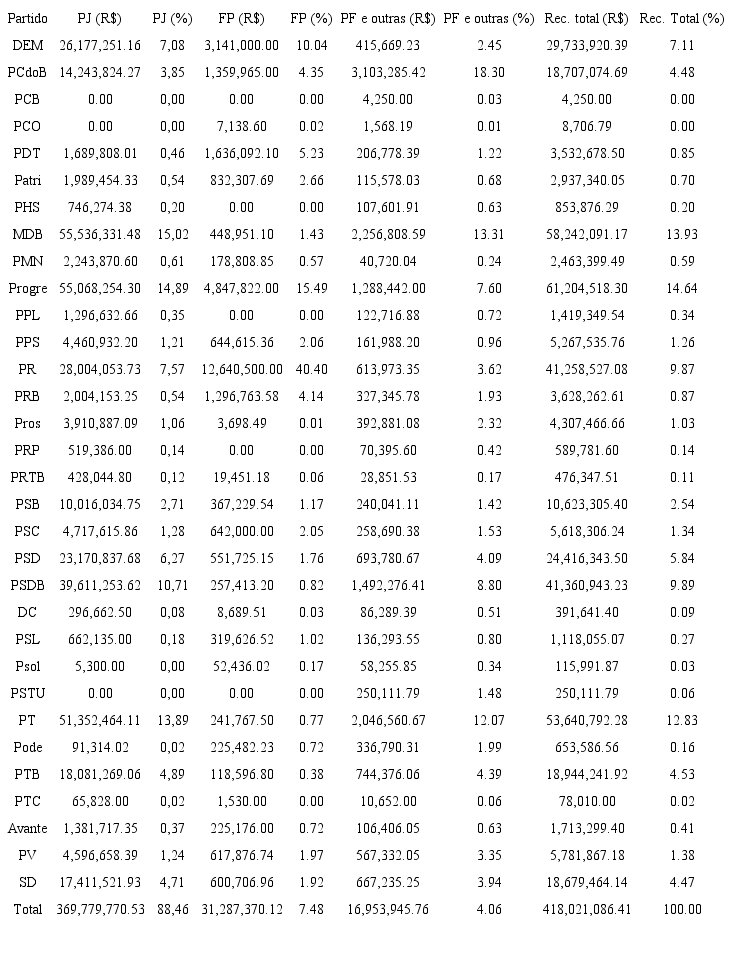 A tabela 3 apresenta a distribuição dos recursos que os partidos repassam aos candidatos a deputado federal. Há uma nítida preponderância de pessoas jurídicas como fontes de tais recursos, com mais de 88 %. O Fundo Partidário, majoritariamente composto de recursos públicos, aparece em um distante segundo lugar, com menos de 7,5 %. Os recursos oriundos de pessoas físicas representam 4 % do total repassado aos candidatos a deputado federal, ou seja, 22 vezes menos que os recursos oriundos de empresas. Até 2014, o financiamento eleitoral era preponderantemente empresarial, seja por meio de doações diretas, seja doações indiretas, intermediadas pelos partidos, como as por ora analisadas.