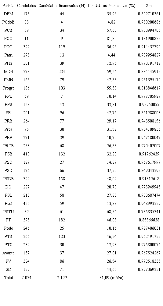 Conclusões: nossos dados apontam que as agremiações distribuem seus recursos com vistas ao potencial eleitoral dos indivíduos malgrado sua estrutura organizacional. Não importa quão robusto institucionalmente é um partido político, todos os recursos são concentrados em poucos candidatos. Tal estratégia revela que a estrutura organizacional dos partidos políticos brasileiros não guarda relação com a estratégia partidária durante as eleições legislativas.
