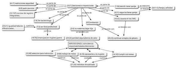 El gráfico 2 resume algunas decisiones e imposiciones experimentadas por las mujeres en su permanencia en las FARC-EP, planteadas anteriormente: