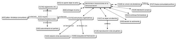 Si bien son múltiples los asuntos y vivencias asociados a la reincorporación, para el caso en estudio las decisiones o imposiciones que se analizan se relacionan únicamente con la dinámica organizativa y comunitaria producto de la reincorporación y la formación profesional, con respecto a lo cual se logró mayor detalle en la información.