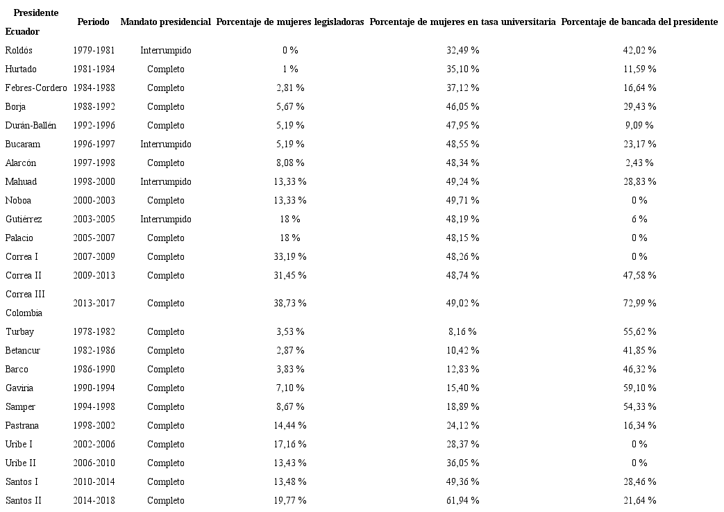 Una cuestión también importante es el incremento del porcentaje de mujeres en la legislatura, conforme transcurre el tiempo. Por ejemplo, en Ecuador se pasa de un 0 % de mujeres en el Congreso en el caso de Roldós, y de un escaso 3,53 % para el caso de Colombia en la presidencia de Turbay, a un 38,73 % de mujeres con presencia en la Asamblea de Ecuador y a un 19,77 % para Colombia, ambos porcentajes para los últimos periodos observados. Estos datos se condicen con la implementación de las leyes de cuotas en los dos países, tendientes a reducir las asimetrías de género ampliamente arraigadas en las esferas de decisión política.