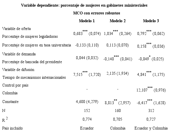 Metodología: para esta investigación, seguimos la literatura que ha identificado variables de oferta, demanda y difusión al señalar los factores que afectan la llegada de mujeres a los gabinetes, y testeamos variables de todos los grupos. Comparamos Ecuador y Colombia desde 1978 hasta 2018, utilizando una base de datos inédita (N = 312), con una medición trimestral. Desarrollamos nuestro análisis con una regresión múltiple de mínimos cuadrados ordinarios y errores robustos.