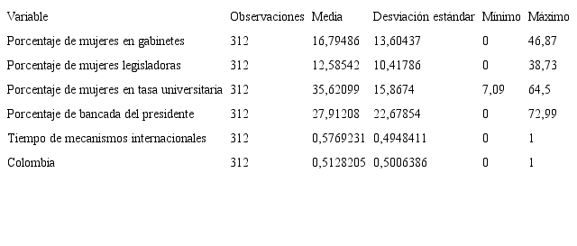 Finalmente, para la medición de la variable de difusión considerada, relativa al influjo que ejerce la ratificación de tratados internacionales, tomamos como instrumento paradigmático la IV Conferencia Mundial sobre la Mujer de Beijing, 1995. Trabajamos con una variable de tipo dicotómica que otorga el valor de 0 en todos los años en que el instrumento jurídico de inclusión de la mujer en la representación descriptiva política no había sido adoptado y el de 1 para los años en que dicho instrumento se generó. Esto nos permite capturar de forma aproximada el efecto del tratado en comparación con los periodos en que este no existía. Todas las variables explicativas son medidas de forma trimestral; el anexo 1 corresponde a una tabla descriptiva de las variables utilizadas.