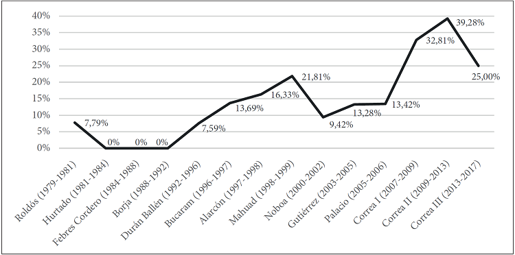 De otro lado, la variable dependiente de esta investigación también ha tenido importantes variaciones a lo largo del tiempo. En los dos países estudiados se ha pasado de niveles mínimos de presencia de mujeres en el Ejecutivo al inicio de la década del ochenta a observar porcentajes que bordean el 40 % en el segundo mandato del expresidente Correa en Ecuador (2009-2013). En Colombia el escenario es bastante similar; el porcentaje de mujeres en ministerios en el periodo inicial del estudio es nulo y en el último periodo observado, correspondiente al expresidente Santos, llega aproximadamente al 34 % de mujeres al frente de carteras de Estado. Estos hallazgos primarios son importantes, tomando en cuenta que, pese a la existencia de leyes de cuotas, los puestos del Ejecutivo no se sujetan a estas disposiciones, y es por tanto un campo más propenso a la inequidad de género (Caminotti, Rotman y Varetto 2011).