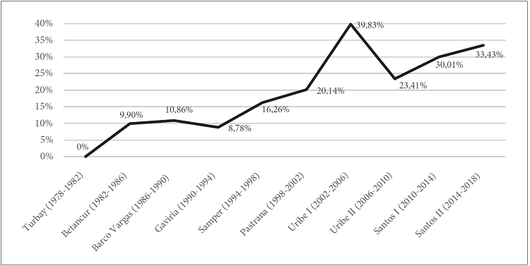 En el caso colombiano, todos los presidentes cuyos periodos fueron analizados contaron con una importante fuerza en la legislatura, a excepción de Álvaro Uribe, quien durante sus ocho años de mandato no tuvo legisladores de su partido (Asociación Primero Colombia). Lo curioso es que, precisamente durante uno de estos periodos, se observa el porcentaje más alto de presencia de mujeres en el Ejecutivo; fue en el primer periodo, del 2002 al 2006, cuando el nombramiento de mujeres en gabinetes llegó al 40 % aproximadamente.