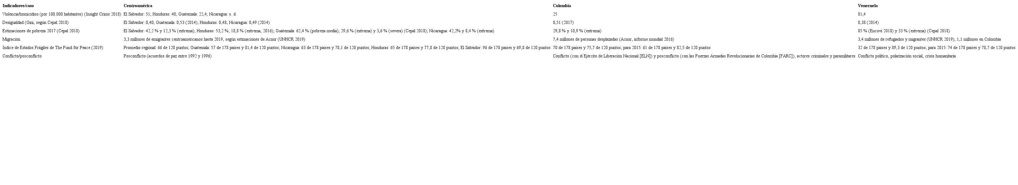 Paradójicamente, América Latina ha sido declarada como “zona de paz”, pese a tener la tasa de homicidios más alta del mundo que supera casi cuatro veces el promedio global. En 2017, cerca de 140.000 latinoamericanos fueron asesinados, en promedio 24 por cada 100.000 habitantes (Jaitman 2017, 1). Entre los conflictos más violentos en América Latina1 destacan el de Centroamérica, por un posconflicto fallido; Colombia, por ser el único país con un conflicto armado interno en vías de solución desde el acuerdo de paz de 2016; y Venezuela, por el colapso económico, político e institucional (Gratius y Puente 2019). Como se resume a continuación, los tres casos tienen en común altos niveles de violencia, rasgos de fragilidad estatal y disfunciones institucionales: