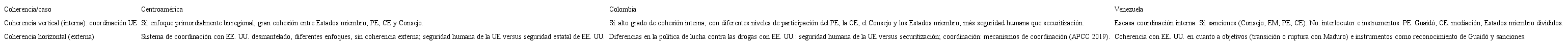 Tras haber comparado discursos, objetivos, instrumentos y acciones europeos en los tres casos (tabla 2), se pueden destacar los siguientes resultados en términos de coherencia vertical y horizontal. En primer lugar, la UE presenta un balance mixto en la utilización del concepto de seguridad (humana o estatal) en sus respuestas a los conflictos en los tres casos analizados. Diferente a su política en Venezuela y, en menor medida, Colombia, en el caso de Centroamérica no hay posiciones internas divergentes entre las instituciones de la UE ni tampoco entre los Estados miembro. Entre los tres casos, la política europea hacia Centroamérica es, sin duda, la más coherente tanto en cuanto a discursos, objetivos, instrumentos y acciones como en relación a la coordinación interna y externa, principalmente con EE. UU. En este caso prevalece claramente un concepto de seguridad humana y no hay evidencia de securitización.