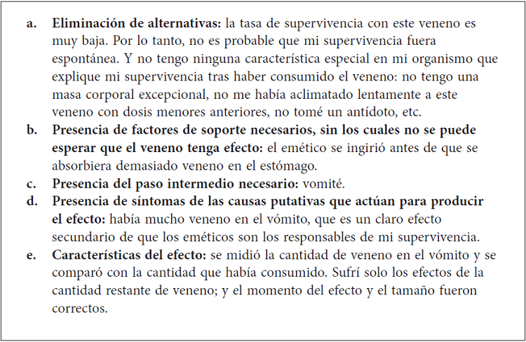 No vamos a detallar el contenido del cuadro para evitar ser reiterativos. Nos centramos en lo que este devela frente a la importancia de contar con el apoyo de información que sirva tanto de evidencia directa como de evidencia indirecta para dar soporte a una hipótesis causal: el medicamento (o emético) m tuvo incidencia en reducir el efecto del veneno v en el cuerpo del individuo i. La evidencia directa representa todo tipo de información que haga referencia a la relación causal primaria que quiere ser explicada. De acuerdo con Cartwright (2017), esta puede hacer alusión a las características del efecto y cómo se espera -según, por ejemplo, literatura especializada- que este se dé en el cuerpo humano (es decir, a en el cuadro 1). De igual forma, resulta oportuno preguntarse sobre los síntomas de la posible causalidad, incluyendo la valoración de efectos secundarios que podrían esperarse del proceso en que se genera el resultado final (d en el cuadro 1), sobre la presencia de factores de soporte (concepto en el que ahondamos más adelante en el texto) que indiquen la existencia de condiciones necesarias (internas al proceso) para que m tuviera un impacto en v (b en el cuadro 1) o la identificación de pasos intermedios en la cadena causal de eventos (e en el cuadro 1). La evidencia indirecta, por su parte, nos ayuda a reflexionar sobre la posibilidad de que nuestra hipótesis causal sea cierta. Cartwright (2017) habla, por tanto, de información que nos sirve para eliminar alternativas a la explicación del surgimiento del fenómeno estudiado (el paso de m a reducir el efecto de v). La frase emblemática de Sherlock Holmes que indica que “cuando eliminas toda solución lógica a un problema, lo ilógico, aunque imposible, es invariablemente lo cierto” resulta pertinente para ilustrarlo (ver segunda frase de a en el cuadro 1).