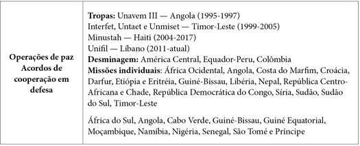 A principal participação das Forças Armadas em apoio à política externa brasileira, a operação de paz no Haiti, chegou ao fim em 2017. Logo em seguida, a ONU solicitou ao Brasil o envio de um batalhão para a operação da ONU na República Centro-Africana (RCA). Por conta do convite, enquanto o Itamaraty se engajava politicamente, o Ministério da Defesa e as Forças Armadas iniciaram o planejamento. Militares, diplomatas e funcionários do governo foram enviados ao Quartel General da ONU, em Nova York, e em missões de reconhecimento na RCA. No entanto, cinco meses depois, o governo respondeu negativamente, decisão justificada pelos problemas financeiros que o país vivia e pela intervenção federal na segurança pública do estado do Rio de Janeiro (Aguilar 2018). Atualmente, apesar de várias participações individuais com observadores militares, oficiais de ligação e de Estado-Maior (ONU 2020), a única presença de porte nas operações de paz encerrou-se com a retirada do contingente da Marinha da Unifil, em dezembro de 2020 (Boinas-Azuis 2020).