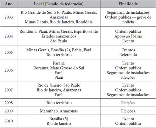 Desde meados da década de 1990, dezenas de operações foram realizadas pelas Forças Armadas para a garantia da ordem pública (incluindo ações relacionadas com greves de policiais e caminhoneiros) e a segurança de eleições e plebiscitos, eventos importantes, instalações, presídios e ações de outros órgãos do Estado.