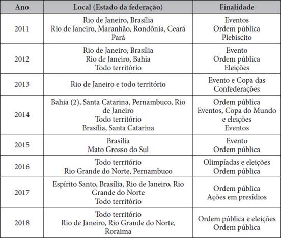 O uso das forças armadas em GLO tradicionalmente era realizada a pedido dos governadores dos estados ou de instituições do Estado, por exemplo, do Superior Tribunal Eleitoral para a segurança das eleições. No entanto, entre fevereiro e dezembro de 2018, ocorreu a primeira “intervenção federal” desde promulgada a Constituição de 1988, na cidade do Rio de Janeiro, que resultou na indicação de um general do Exército para ocupar o cargo de secretário de segurança daquela cidade e de generais em funções naquela secretaria e no gabinete da intervenção federal. O objetivo principal da intervenção foi reorganizar a gestão do Estado na área de segurança e reduzir os índices de criminalidade bem como coordenar ações ostensivas e cívico-sociais em áreas consideradas estratégicas da cidade.