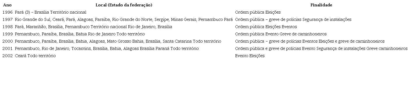 A Lei Complementar 97, de 1999, tratou das “normas gerais para a organização, o preparo e o emprego das Forças Armadas” (Brasil 1999) e foi alterada pela Lei Complementar 117, de 2004, cujo texto abordou o uso dos militares em operações de GLO (art. 142, Constituição Federal de 1988) de segurança pública (art. 144, Constituição Federal de 1988). Segundo o parágrafo 3º da lei, elaborado em consonância com o Decreto 3.897 de 24 de agosto de 2001,10 e que aborda as diretrizes para o emprego das Forças Armadas em operações de GLO: