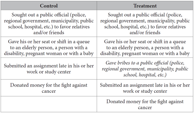 Originality: This work has two main contributions; first, it highlights the importance designing unobtrusive measures when studying the prevalence of corrupt practices in Latin America; and second, it shows that policy interventions to fight corruption may not be equally effective across different groups of the population.