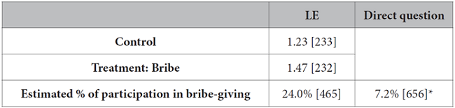 To test the expectations of H1, we focus on the global results of the LE and then compare them to the direct question. The difference between the means of the control and treatment group is interpreted as a proportion (since the difference between the two can be interpreted as the percentage that admits having participated in bribery). We also calculated the percentage of respondents from the direct question that had admitted to having engaged in bribery.
