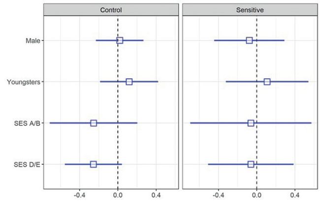 However, are there differences across subgroups in the way they answer the experimental and the direct question about their bribing behavior? To analyze whether this is the case, we compare the substantive results between the estimated effects through the item-count technique regression for the LE and the min-max scaling of the effects in a logit regression with the direct question.