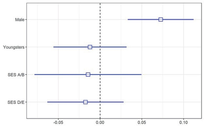 Finally, results remain mostly unchanged after introducing an interaction term between young age and high SES (A/B), as we can see in Figures 5 and 6.14 There is not enough evidence in favor of H4, since there is not a substantive nor significant difference in the way young high-class respondents report their bribing behavior. Nevertheless, when the interaction term for young from the high SES is introduced, the coefficient for SES A/B in the LE regression turns positive, although the coefficient is still not significant and close to zero. This may indicate that the slight underreporting of past bribing behavior originally attributed to high SES may be driven by the younger cohort of that social group.