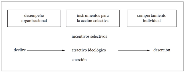 Argumentamos que el declive organizacional aumenta la probabilidad de deserción entre los miembros de los grupos armados, porque los instrumentos que les permiten superar los problemas de acción colectiva -incentivos selectivos, atractivo ideológico y coerción- son menos efectivos durante los periodos de declive (figura 1).5