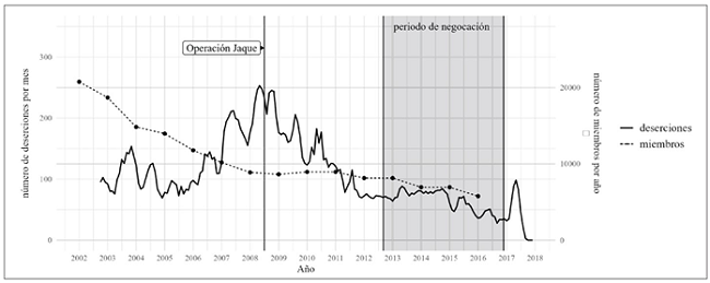 Con las negociaciones en curso, las deserciones de las FARC comenzaron a estabilizarse a partir de 2012 ya que la mayoría de los miembros ahora tenían la perspectiva de obtener un trato potencialmente mejor a través de la desmovilización colectiva, sin necesidad de romper los lazos con la organización. Aun así, el número de deserciones siguió siendo considerable, lo que sugiere un nivel básico de deserciones en gran parte independiente de la dinámica organizativa.
