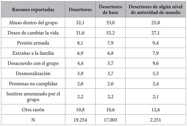 Es posible que las Fuerzas Armadas colombianas también tuvieran interés en mostrar éxito inflando las cifras de deserción de las FARC. Durante la década de 2000, varias unidades militares llevaron a cabo ejecuciones extrajudiciales de civiles para aumentar el recuento de cadáveres de los rebeldes, conocido como el infame escándalo de “falsos positivos”.21 Hasta la fecha, sin embargo, no hay evidencia clara de que las Fuerzas Armadas inflaran de manera similar las cifras de deserción de las FARC. Además, las FARC no utilizaron el programa de deserción para alentar la salida de los heridos y los miembros mayores22; de hecho, vieron el programa como una herramienta de contrainsurgencia (FARC-EP 2013).