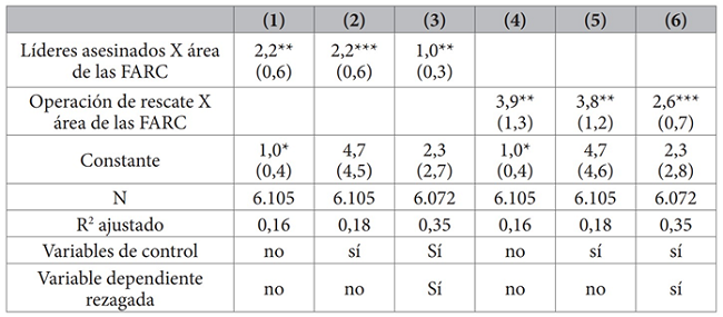 Al examinar el desempeño militar, nos enfocamos en las variables independientes de asesinatos de líderes de las FARC y operaciones de rescate de rehenes secuestrados con importancia a nivel nacional, ya que estos fueron notados rápida y ampliamente por la mayoría de los combatientes de las FARC. Primero, incluimos todos los asesinatos por parte de las Fuerzas Armadas de líderes de las FARC que formaban parte del Estado Mayor Central, principal órgano de gobierno de las FARC: Negro Acacio (fecha del asesinato: 2 de septiembre de 2007), Martín Caballero (24 de octubre de 2007), Raúl Reyes (1 de marzo de 2008), Mono Jojoy (22 de septiembre de 2010) y Alfonso Cano (4 de noviembre de 2011). Esta variable toma un valor de 1 durante los tres meses posteriores a los asesinatos y 0 en otros casos (en nuestro apéndice 3 en línea, usamos diferentes ventanas de tiempo). En segundo lugar, utilizamos importantes operaciones de rescate de rehenes secuestrados en poder de las FARC: la Operación Jaque (2 de julio de 2008) y la Operación Camaleón (13 y 14 de junio de 2010). Nuevamente, codificamos los tres meses posteriores a estos eventos como 1 y en otros casos, 0 (proporcionamos diferentes ventanas de tiempo en el apéndice 3 en línea). En el análisis a continuación, mostramos resultados para los indicadores agregados de asesinatos de líderes de las FARC y operaciones de rescate del gobierno (la Tabla A8 en el apéndice en línea incluye resultados para incidentes individuales).