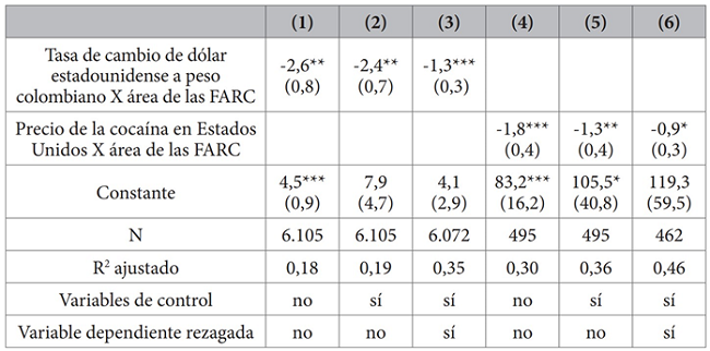 Operacionalizamos los recursos financieros de las FARC usando dos indicadores de ingresos producidos por la economía de la coca. La tabla 3 muestra los resultados de la relación entre recursos financieros y deserción. Los modelos 1 a 3 se centran en las tasas de cambio entre dólar y peso y los modelos 4 a 6 se centran en los precios de la cocaína en los Estados Unidos. Nótese que los modelos para precios de la cocaína se evalúan a nivel de departamento-año, dado que estos precios se reportan anualmente (de ahí el menor número de observaciones y efectos fijos por año, no mes).