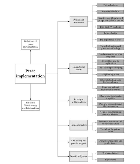 Originalidade: A revisão geral aqui apresentada deve auxiliar estudiosos e formuladores de políticas a compreender os múltiplos debates e desafios no processo de implementação de acordos de paz.