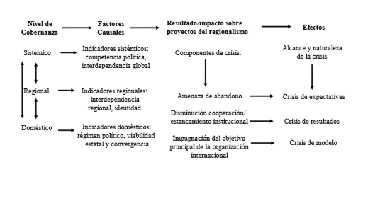Partiendo de la aceptación de esta interacción, el modelo metodológico propuesto entiende la crisis como efecto del impacto de múltiples factores sobre los proyectos del regionalismo. Para interpretarlo rastrea retrospectivamente estos elementos de gobernanza en los niveles sistémico, regional y doméstico, y analiza su impacto sobre los proyectos del regionalismo latinoamericano y sus efectos en forma de crisis (Bennett y Checkel 2015). Estos factores se identifican a partir de una serie de indicadores de gobernanza para cada nivel, proporcionados por las explicaciones de las teorías dominantes del regionalismo, de acuerdo con la reputada y citada síntesis de Andrew Hurrell (1995) . El argumento que se plantea es que los resultados de esta interacción sobre los proyectos regionales pueden relacionarse con algunos de los cuatro componentes del concepto de crisis, lo que nos permite identificar el vínculo causal, y determinar el alcance y la naturaleza de la crisis como efecto final del proceso. Identificar el ámbito donde se localizan los factores de crisis puede arrojar luz sobre la pertinencia de los objetivos constitutivos de los proyectos, así como de aspectos de diseño como la membresía, el alcance o la flexibilidad. Del mismo modo, establecer la naturaleza de la crisis puede contribuir a determinar los cambios institucionales necesarios para superarla. El esquema de este marco de análisis queda como sigue: