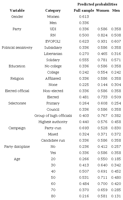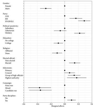 The results indicate a party effect, given the statistically significant differences between all parties. Leaders from the UDI have the lowest predicted probability of supporting quotas, at 34 % (see Table A3 in the Appendix). In comparison, an EVOPOLI party leader is 29 % more likely to support quotas than a UDI party leader, and an RN party leader is 16 % more likely than a UDI party leader. Additionally, the belief that candidate nominations are determined within parties and that party discipline is highly valuable has a positive marginal effect on quota support compared to those who prioritize individuals over organizations. On the other hand, leaders who report that parties do not manage political campaigns are more likely to disapprove of gender quotas.