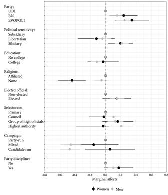 Figure 2 compares the marginal effects in the full model for separated samples of women and men (see Table A3 in the Appendix for predicted probabilities). For women, several explanatory variables lose statistical significance. The marginal effect between EVOPOLI and UDI party membership, as well as RN and UDI, are still positive and statistically significant (with a predicted probability of 93 % for a woman EVOPOLI party leader to supporting quotas vs. 59 % for UDI at with a 95 % confidence interval), and a solidary sensitivity (78 % vs. 46 % libertarian). The marginal effect of non-affiliation to a religion is large and negative.