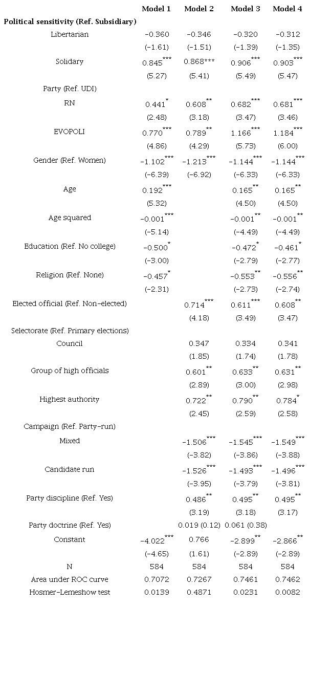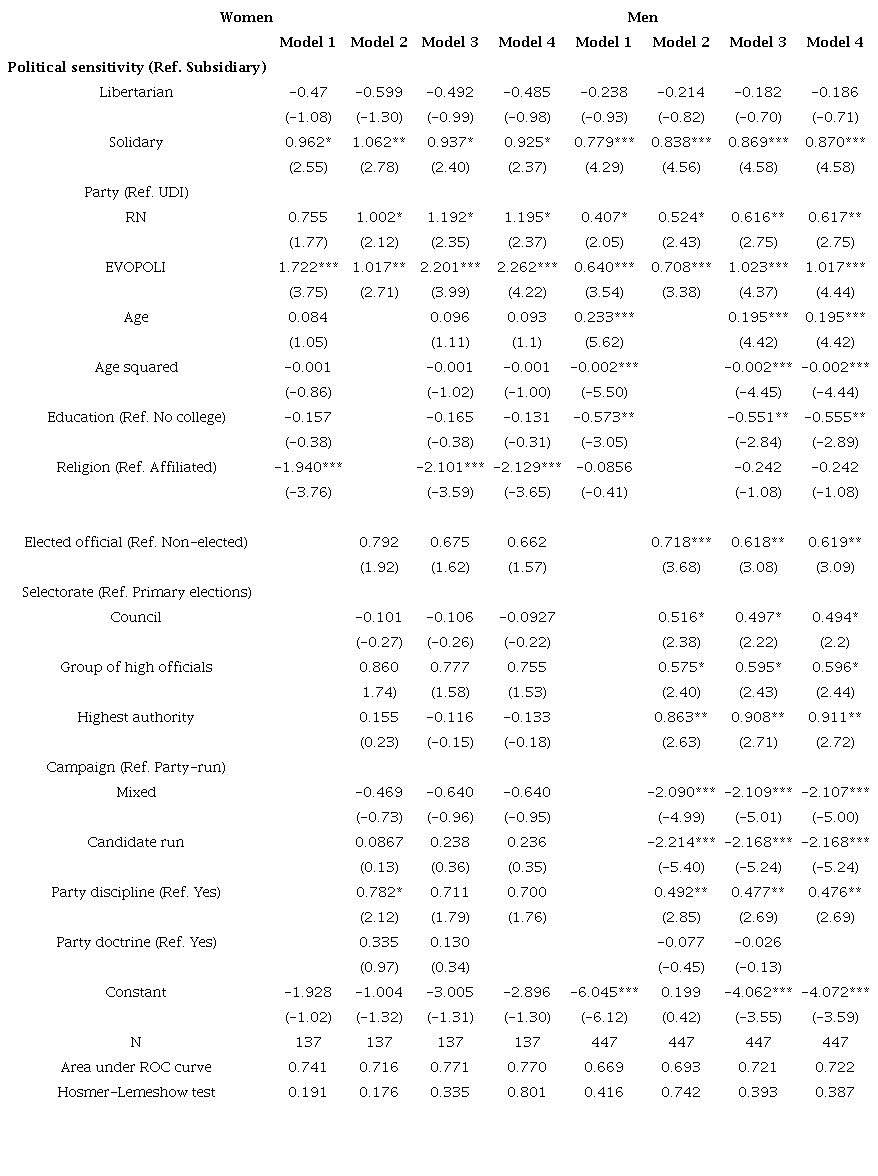The dependent variable is a dummy variable based on the question: “Do you agree or disagree with a reform that makes it mandatory for parties to run a fixed percentage of female candidates to Congress?” Party membership adopts the value reported (UDI, RN, EVOPOLI). For the measurement of left-leaning attitudes, I use a variable called political sensitivity25 that assesses the respondent’s perspective on the desirable role of the State in the economy (Alenda et al. 2020). Thus, this variable takes the value of libertarian,26 subsidiary,27 and solidary,28 showing an increasing degree of agreement with the State’s involvement in economic affairs. This variable concentrates on the subsidiary sensitivity (55 %), then solidary (31 %), and lastly, libertarian (14 %). Interestingly, the distribution does not correlate with political parties (UDI is 12 % libertarian, 59 % subsidiary, and 29 % solidary; RN is 14 % libertarian, 57 % subsidiary, and 36 % solidary; EVOPOLI is 17 % libertarian, 47 % subsidiary, and 31 % solidary).29