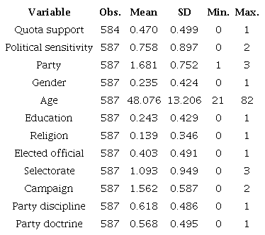 The argument develops as follows. The next section engages with the literature on descriptive representation and gender quotas. It also deals with comparative findings about conservative elites and women’s interests. The third section concentrates on a brief history of women and politics in Chile. The fourth section displays the results of a series of logistic regressions with a finite-sample correction to tap into the determinants of conservative party elites’ support of legislative gender quotas. The results highlight a gender gap among conservative elites to support affirmative action in electoral politics. The final section concludes and delineates the avenues for future research.