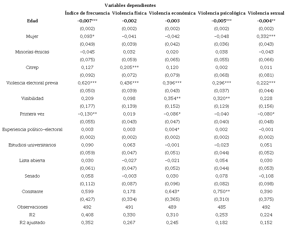 En relación con el género, los resultados revelan que las mujeres candidatas tienen una mayor probabilidad de reportar hechos de violencia sexual y de experimentar con mayor frecuencia la violencia electoral en comparación con los hombres. Sin embargo, los resultados relacionados con la frecuencia no son muy robustos (p < 0,1). Los efectos marginales para la violencia sexual dan cuenta de que las mujeres tienen un 33 % más de probabilidad de reportar violencia sexual que los hombres. Estos resultados confirman la hipótesis H3.