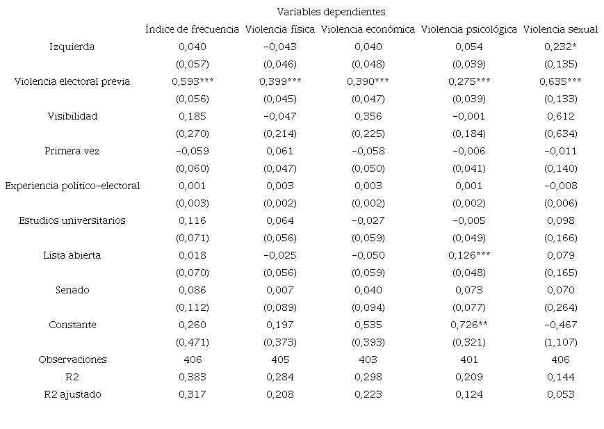 Finalmente, nuestros resultados respecto a la relación entre la ideología política y la exposición a la violencia electoral no muestran diferencias significativas (tabla 3) entre las candidaturas que se autorreconocen como de izquierda, en comparación con sus contrapartes de centro-derecha (H6). Las estadísticas descriptivas de la encuesta muestran que las candidaturas de izquierda reportaron tasas similares de violencia física (32 % vs. 28 %), violencia económica (60 % vs. 58 %) y violencia psicológica (84 % vs. 82 %), en comparación con las candidaturas de centro y derecha. Aunque se observan algunas diferencias porcentuales que indican que las candidaturas de izquierda son relativamente más afectadas, estas diferencias no son estadísticamente significativas. El único resultado significativo se relaciona con las candidaturas de izquierda que fueron más propensas a reportar hechos de violencia sexual en comparación con las de centro y derecha, pero los resultados no son muy robustos (p < 0,1). La probabilidad de que una candidatura de centro y de derecha reporte un hecho de violencia sexual es del 27 %, mientras para la candidatura de izquierda es del 50 %; es decir, hay una diferencia de 23 puntos porcentuales.