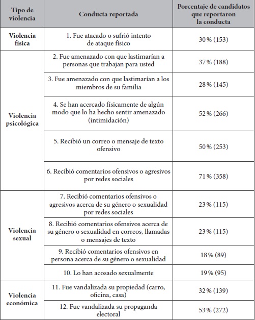 Originality: Although studies on electoral violence are abundant, few focus on the candidates. This is the first time in Colombia that a survey has been conducted with candidates that investigates forms of electoral violence that go beyond physical violence, such as psychological, economic, and sexual violence.