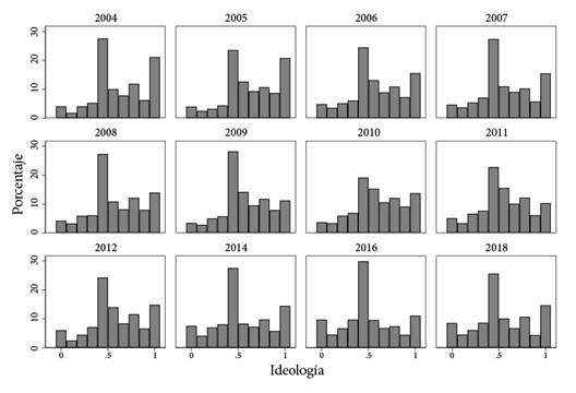 Como se dijo, los datos provenientes de encuestas indican que no existe polarización ideológica entre los votantes, pese a que los niveles de polarización de la élite podrían ejercer un efecto significativamente fuerte en la clasificación ideológico-partidista de los ciudadanos (Borda 2018; Davis y Dunaway 2016). La figura 1 muestra histogramas de las respuestas de los encuestados entre 2004 y 2018 a la pregunta sobre autoubicación ideológica, en una escala de 0 (izquierda) a 1 (derecha). Aunque para algunos años -especialmente desde 2012- parece crecer la frecuencia de quienes se ubican en los extremos del espectro ideológico, en todas las mediciones el centro es el lugar de la escala más elegido por las y los colombianos.9